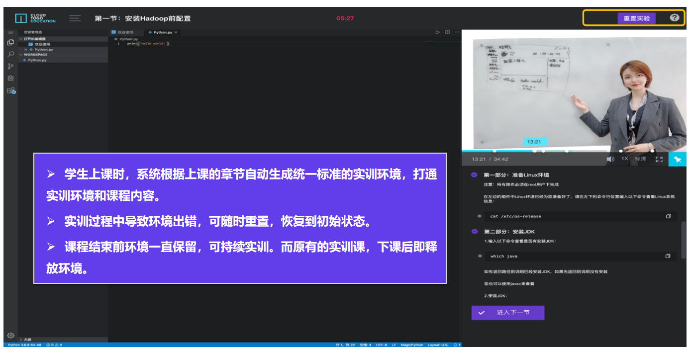 · 一个网页内,边理论学习、边实训:边学边操作,实训操作与学习内容同屏展示。