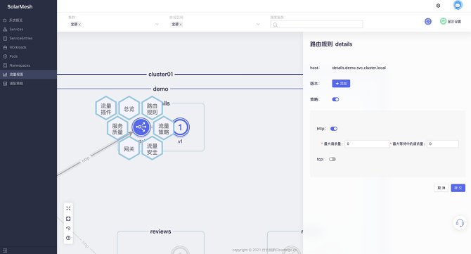 从整体的流量试图中可以看到本地微服务(一个Demo微服务,来自GitHub)的架构组成。每个服务节点都可以点开SolarMesh的控制面板,包括:总览、路由规则、流量策略、流量安全、网关、服务质量、流量插件。