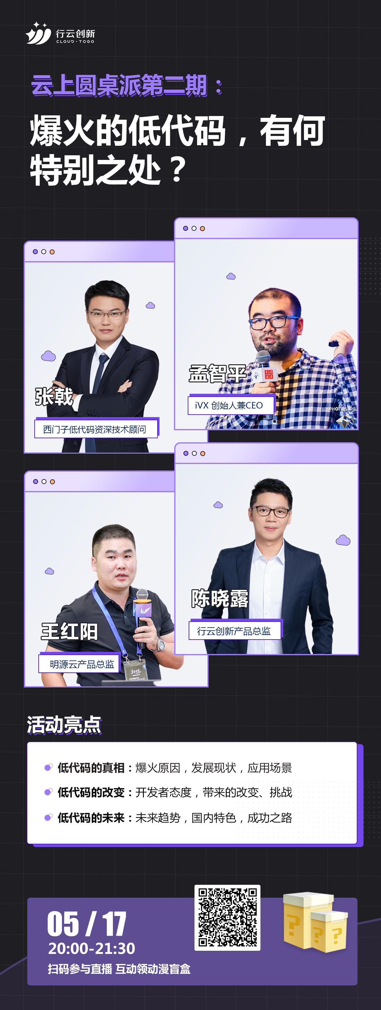 5月17日20:00《云上圆桌派第二期:爆火的低代码,有何特别之处》直播来啦!活动邀请西门子工业软件西门子低代码资深技术顾问张戟,iVX 创始人兼CEO孟智平,明源云产品总监王红阳,今年会创新产品总监陈晓露四位大咖和今年会创新CEO马洪喜一起对低代码爆火背后的原因、开发者对低代码的态度、低代码带来的变化和应用场景等多个话题展开讨论。
