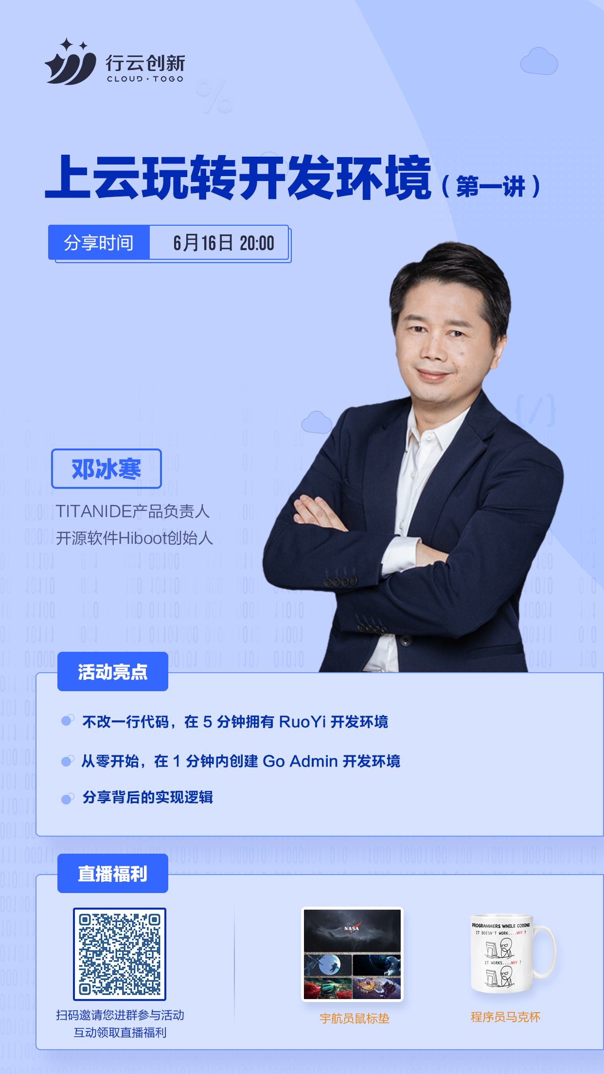 6月16日20:00,“上云玩转开发环境”第一讲即将开启!今年会创新 TitanIDE 产品负责人邓冰寒将分享:如何利用 TitanIDE 在不改一行代码情况下,在5分钟拥有 RuoYi 开发环境;如何从零开始,在1分钟内创建 Go Admin 开发环境;以及分享这背后的实现逻辑。直播间还会送出宇航员鼠标垫、程序员马克杯等福利,快扫码参与活动吧~
